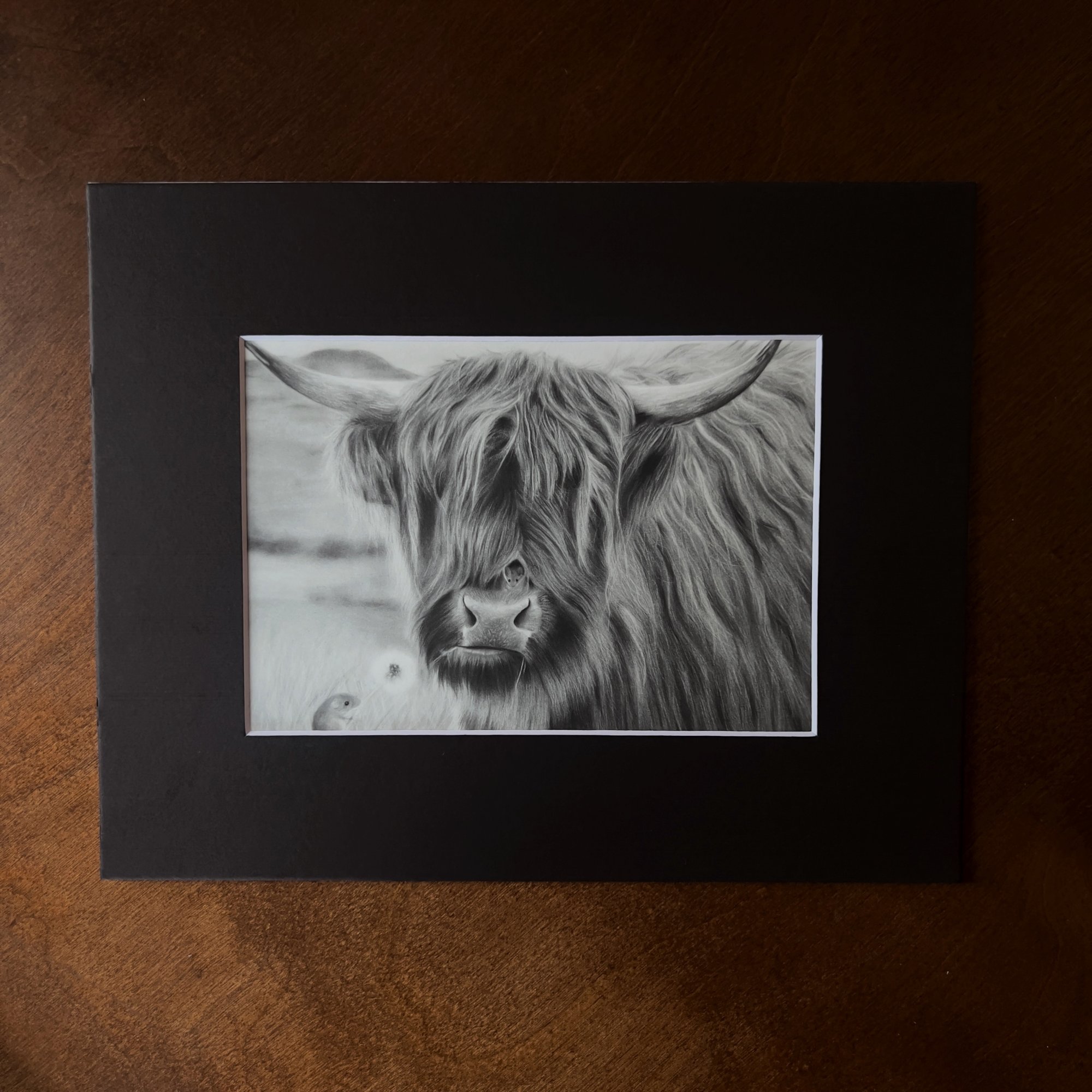 A hand-crafted mini fine art print of my original charcoal drawing — printed using professional Lucia Pro inks for rich depth and lasting quality. Each print measures 5x7 inches and comes mounted in an 8x10 matte, ready to frame or gift.