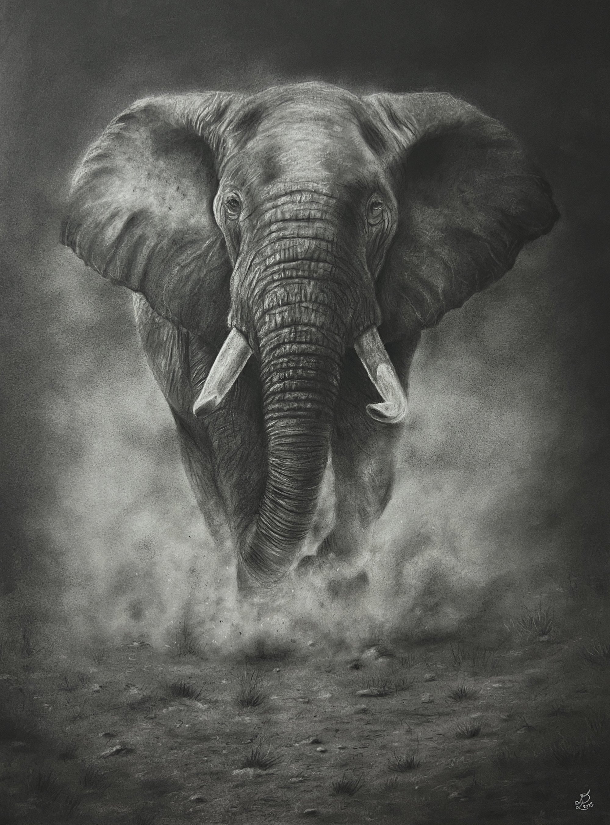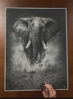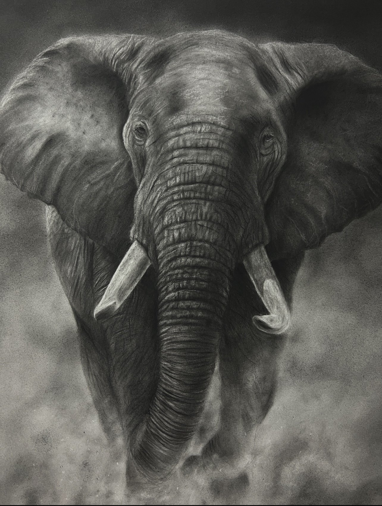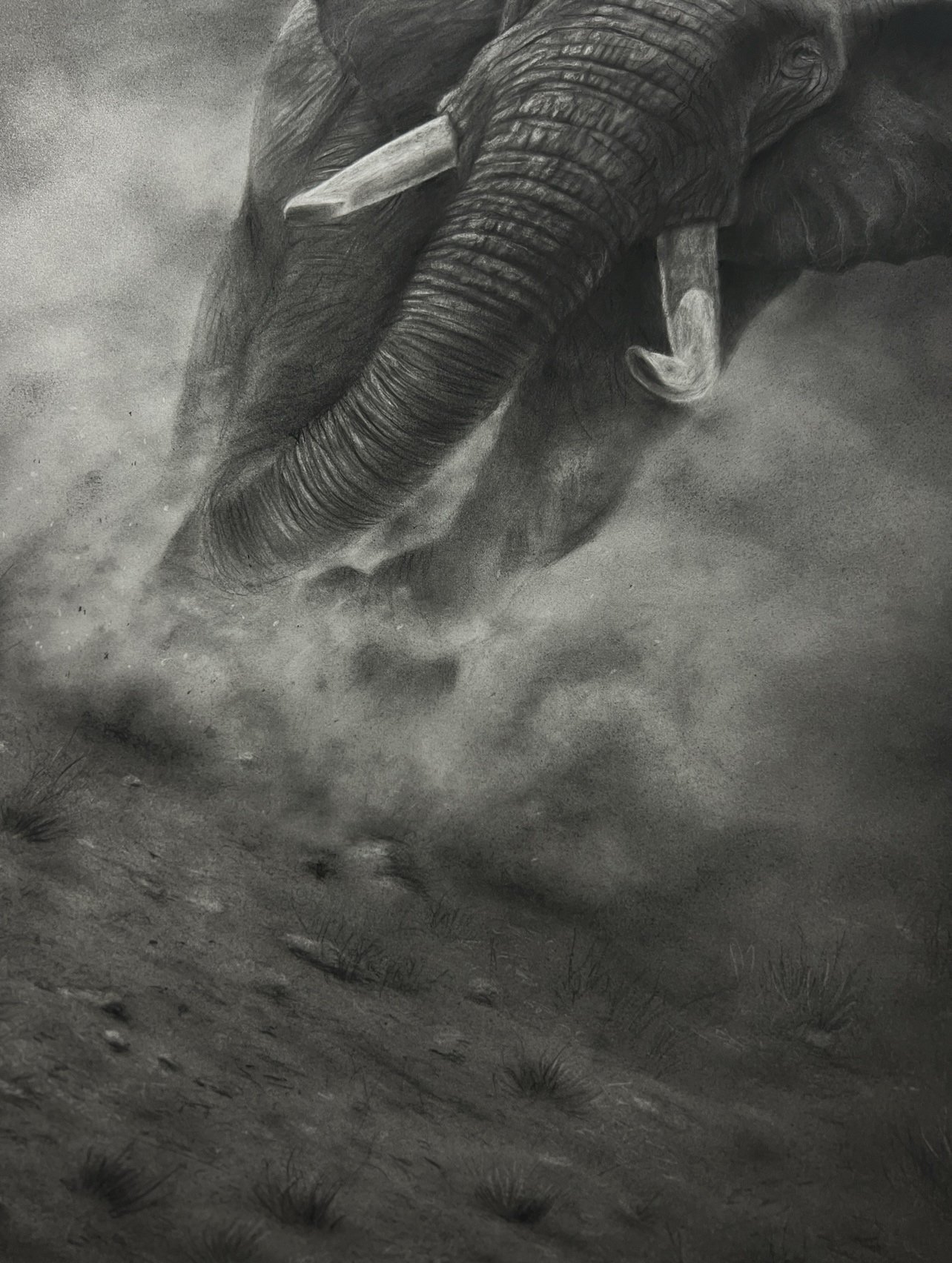 Every layer of charcoal was built slowly, with intention, to mirror the calm weight and wisdom of the elephant.The soft diffusion of dust adds the motion but keeps it from being rage. The lighting and shading capture the presence emerging. The eyes and body posture show focus and awareness, not hostility.