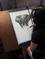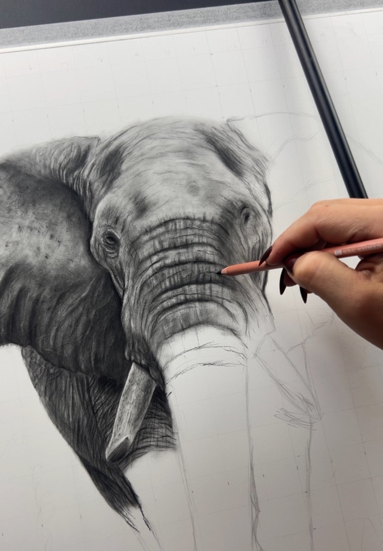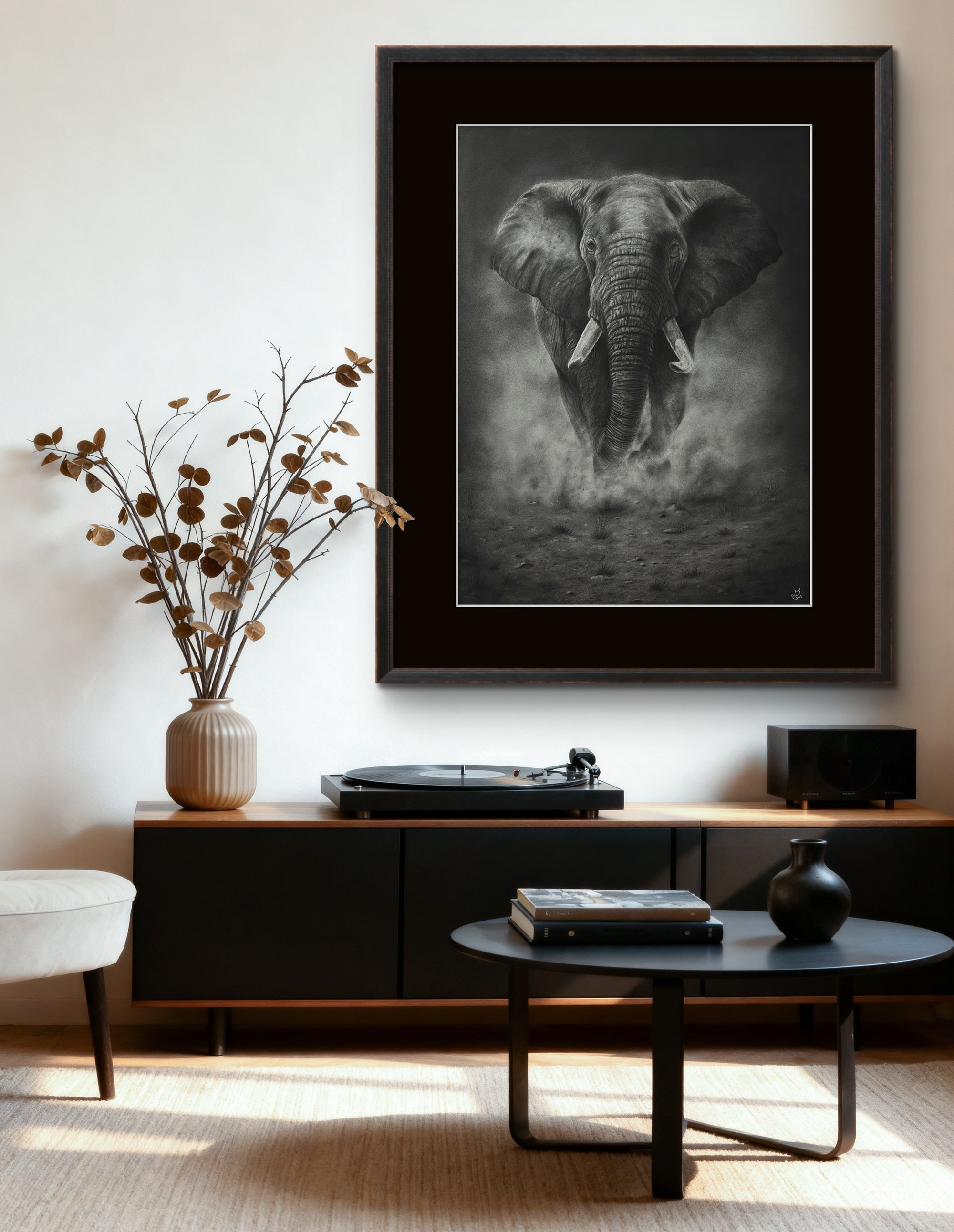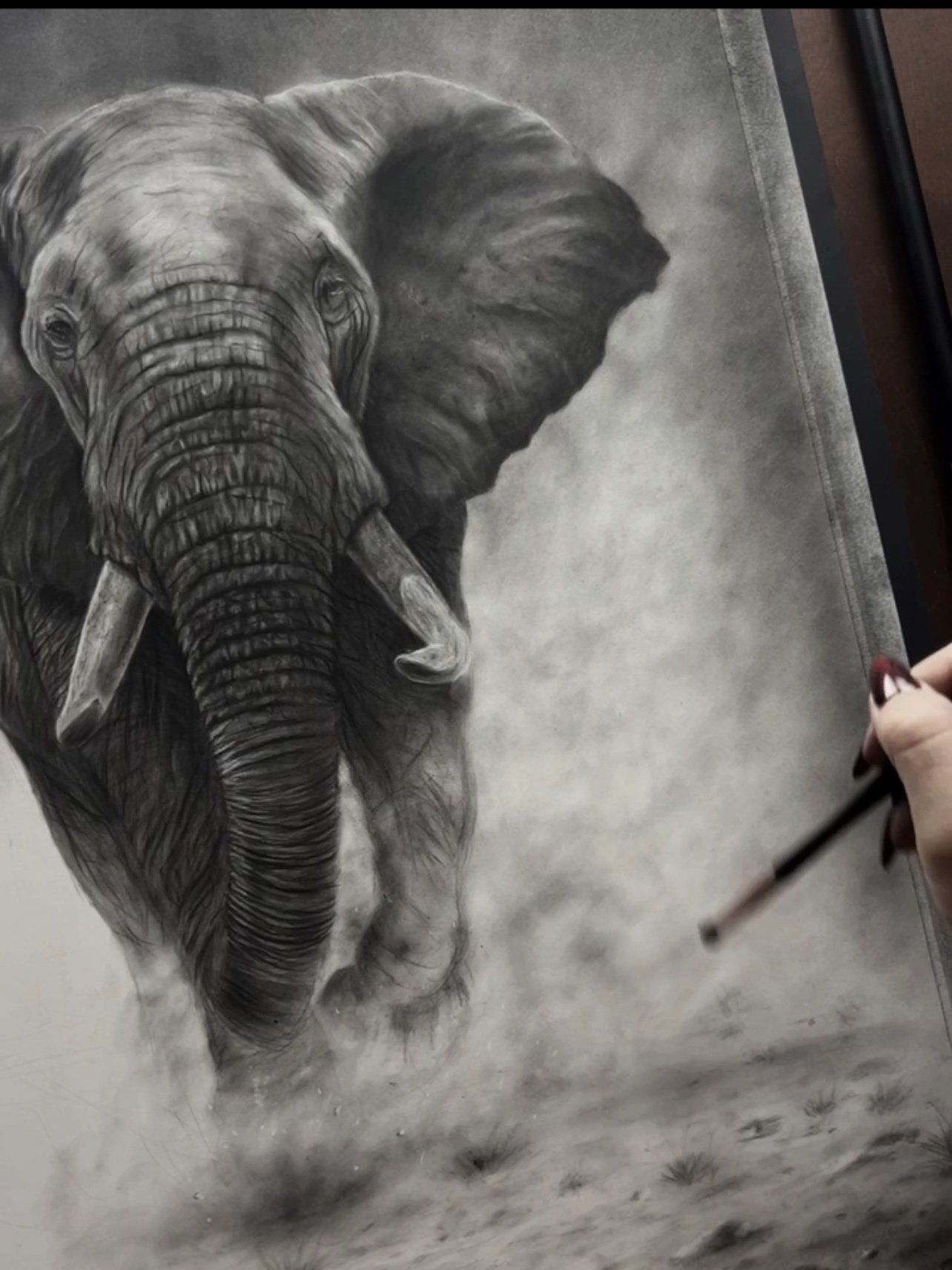 Every layer of charcoal was built slowly, with intention, to mirror the calm weight and wisdom of the elephant.The soft diffusion of dust adds the motion but keeps it from being rage. The lighting and shading capture the presence emerging. The eyes and body posture show focus and awareness, not hostility.
